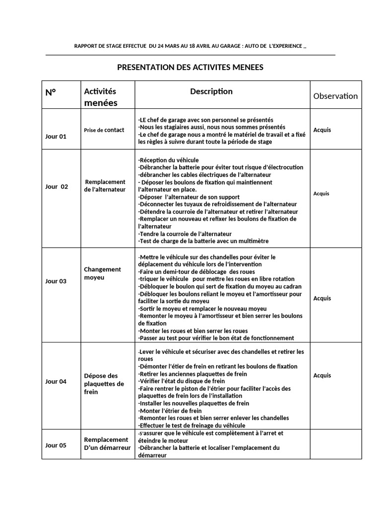 RAPPORT DE STAGE EFFECTUE DU 24 MARS AU 18 AVRIL AU GARAGE : AUTO DE L’EXPERIENCE ,,