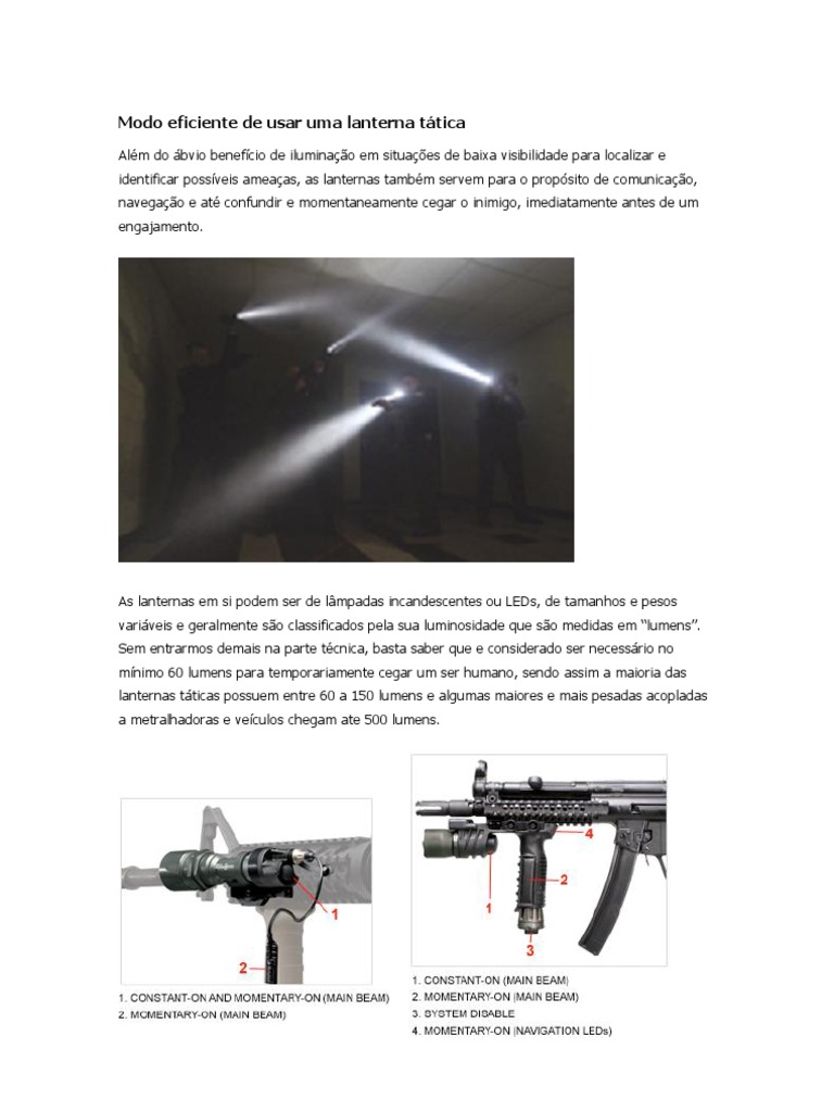 As lanternas em si podem ser de lmpadas incandescentes ou LEDs, de tamanhos e pesos variveis e geralmente so classificados pela sua luminosidade que so medidas em lumens. Sem entrarmos demais na parte tcnica, basta saber que e considerado ser necessrio no mnimo 60 lumens para temporariamente cegar um ser humano, sendo assim a maioria das lanternas tticas possuem entre 60 a 150 lumens e algumas maiores e mais pesadas acopladas a metralhadoras e veculos chegam ate 500 lumens.