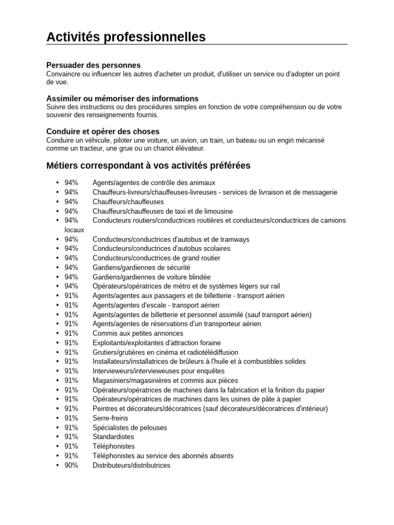 Métiers correspondant à vos activités préférées