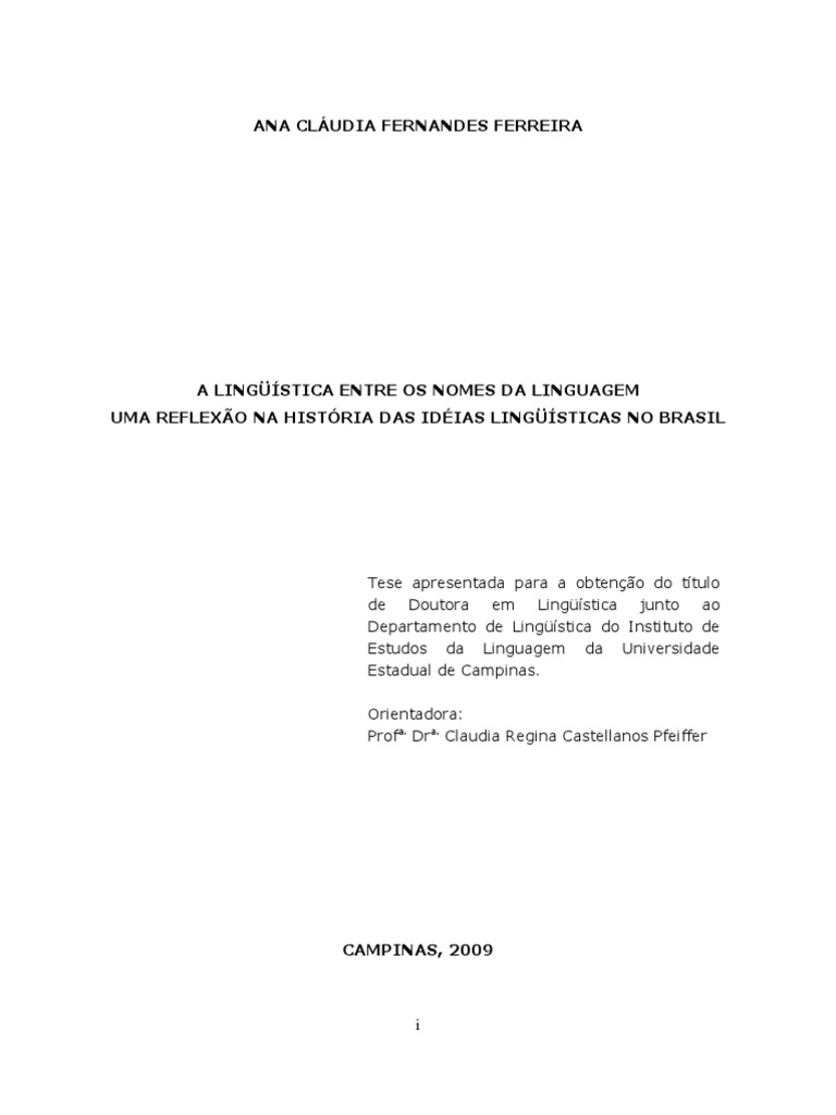 Ferreira, Ana Cludia Fernandes. A Lingustica entre os nomes da linguagem uma reflexo na Histria das Idias Lingusticas no Brasil / Ana Cludia Fernandes Ferreira. -- Campinas, SP : [s.n.], 2009. Orientador : Claudia Regina Castellanos Pfeiffer. Tese (doutorado) - Universidade Estadual de Campinas, Instituto de Estudos da Linguagem.