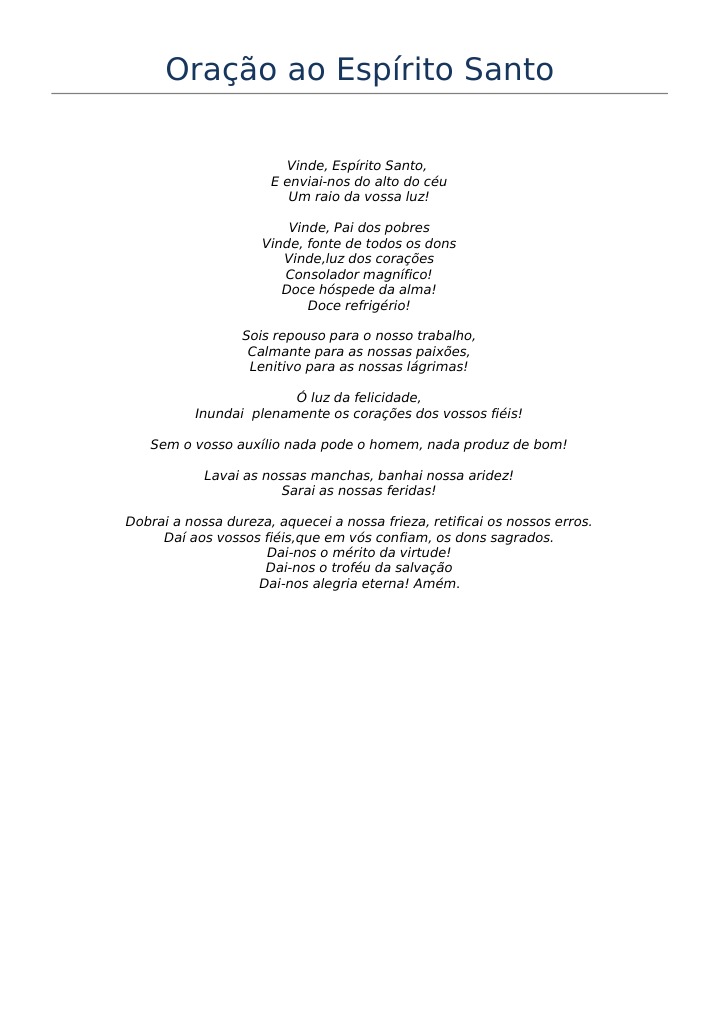 Vinde, Esprito Santo, E enviai-nos do alto do cu Um raio da vossa luz! Vinde, Pai dos pobres Vinde, fonte de todos os dons Vinde,luz dos coraes Consolador magnfico! Doce hspede da alma! Doce refrigrio! Sois repouso para o nosso trabalho, Calmante para as nossas paixes, Lenitivo para as nossas lgrimas! luz da felicidade, Inundai plenamente os coraes dos vossos fiis! Sem o vosso auxlio nada pode o homem, nada produz de bom! Lavai as nossas manchas, banhai nossa aridez! Sarai as nossas feridas! Dobrai a nossa dureza, aquecei a nossa frieza, retificai os nossos erros. Da aos vossos fiis,que em vs confiam, os dons sagrados. Dai-nos o mrito da virtude! Dai-nos o trofu da salvao Dai-nos alegria eterna! Amm.