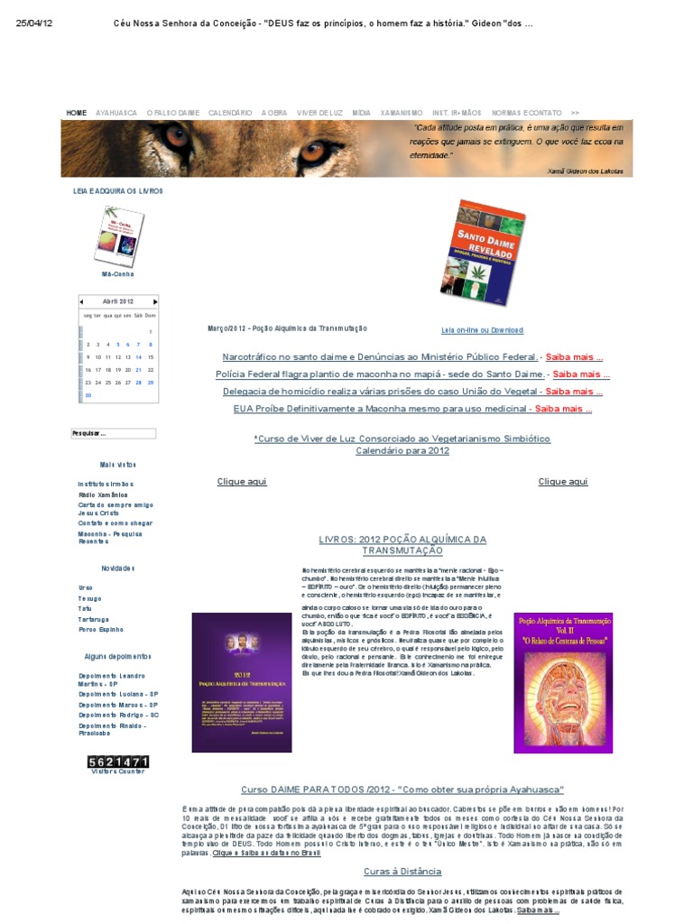 Narcotrfico no santo daime e Denncias ao Ministrio Pblico Federal. - Saiba mais ... Polcia Federal flagra plantio de maconha no mapi - sede do Santo Daime. - Saiba mais ... Delegacia de homicdio realiza vrias prises do caso Unio do Vegetal - Saiba mais ... EUA Probe Definitivamente a Maconha mesmo para uso medicinal - Saiba mais ...
