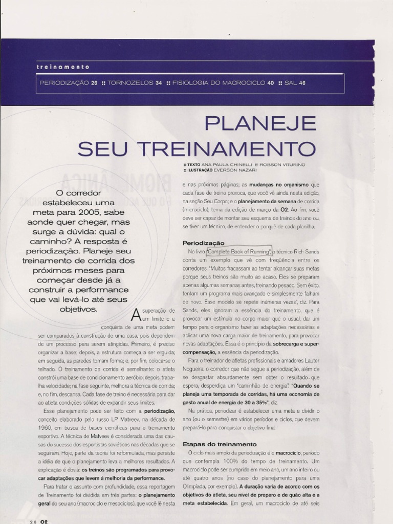 o corredor estabeleceu uma meta para 2005, sabe aonde quer chegar, mas surge a dúvida : qual o caminho? A resposta é period i zação. Planeje seu treinamento de corrida dos próximos meses para começar desde já a construir a performance que vai levá- I o até seus objetivos.