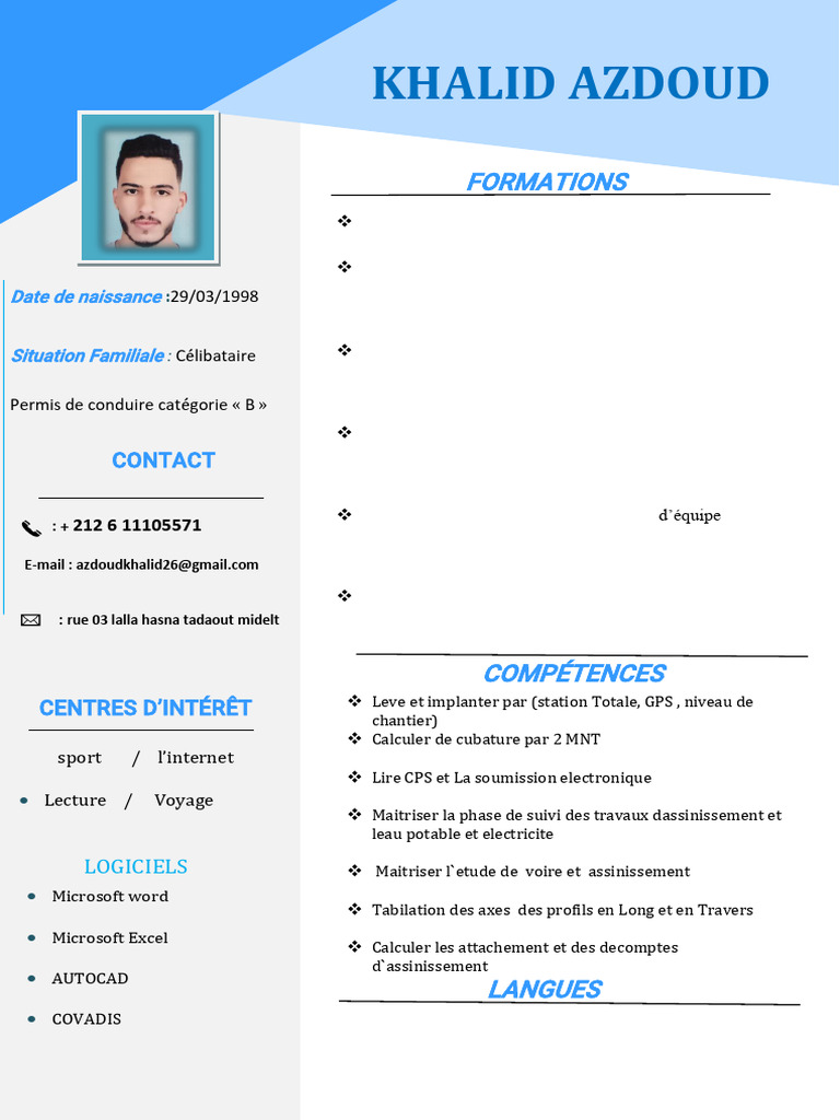 Situation Familiale : Célibataire ❖ Bureau topographie topo atlas :3 mois de stage dans bureau