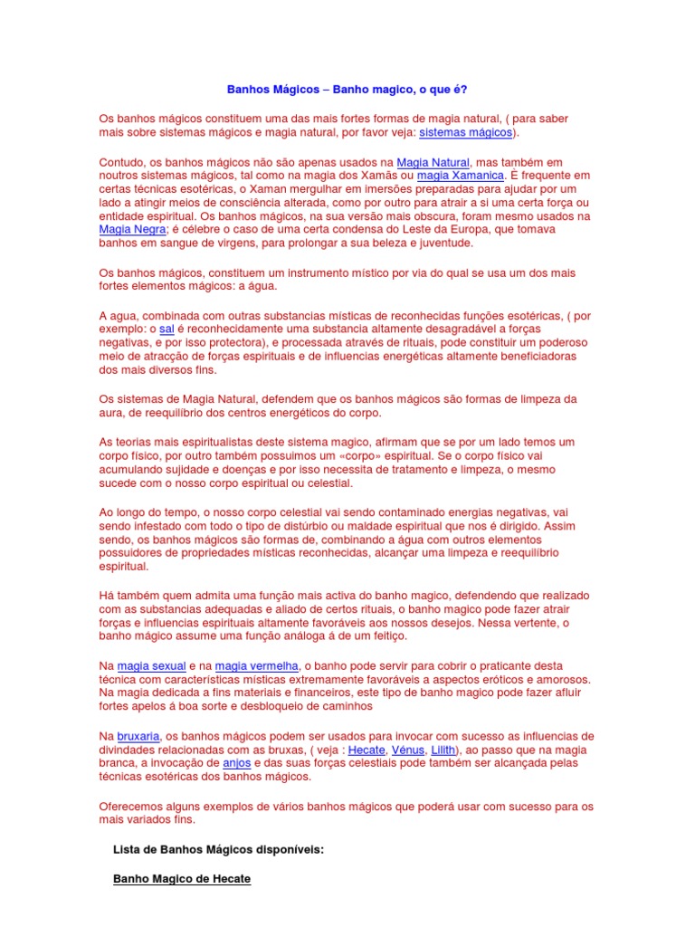 ? Os banhos mgicos constituem uma das mais fortes formas de magia natural, ( para saber mais sobre sistemas mgicos e magia natural, por favor veja: sistemas mgicos). Contudo, os banhos mgicos no so apenas usados na Magia Natural, mas tambm em noutros sistemas mgicos, tal como na magia dos Xams ou magia Xamanica. frequente em certas tcnicas esotricas, o Xaman mergulhar em imerses preparadas para ajudar por um lado a atingir meios de conscincia alterada, como por outro para atrair a si uma certa fora ou entidade espiritual. Os banhos mgicos, na sua verso mais obscura, foram mesmo usados na Magia Negra; clebre o caso de uma certa condensa do Leste da Europa, que tomava banhos em sangue de virgens, para prolongar a sua beleza e juventude. Os banhos mgicos, constituem um instrumento mstico por via do qual se usa um dos mais fortes elementos mgicos: a gua. A agua, combinada com outras substancias msticas de reconhecidas funes esotricas, ( por exemplo: o sal reconhecidamente uma substancia altamente desagradvel a foras negativas, e por isso protectora), e processada atravs de rituais, pode constituir um poderoso meio de atraco de foras espirituais e de influencias energticas altamente beneficiadoras dos mais diversos fins. Os sistemas de Magia Natural, defendem que os banhos mgicos so formas de limpeza da aura, de reequilbrio dos centros energticos do corpo. As teorias mais espiritualistas deste sistema magico, afirmam que se por um lado temos um corpo fsico, por outro tambm possuimos um corpo espiritual. Se o corpo fsico vai acumulando sujidade e doenas e por isso necessita de tratamento e limpeza, o mesmo sucede com o nosso corpo espiritual ou celestial. Ao longo do tempo, o nosso corpo celestial vai sendo contaminado energias negativas, vai sendo infestado com todo o tipo de distrbio ou maldade espiritual que nos dirigido. Assim sendo, os banhos mgicos so formas de, combinando a gua com outros elementos possuidores de propriedades msticas reconhecidas, alcanar uma limpeza e reequilbrio espiritual. H tambm quem admita uma funo mais activa do banho magico, defendendo que realizado com as substancias adequadas e aliado de certos rituais, o banho magico pode fazer atrair foras e influencias espirituais altamente favorveis aos nossos desejos. Nessa vertente, o banho mgico assume uma funo anloga de um feitio. Na magia sexual e na magia vermelha, o banho pode servir para cobrir o praticante desta tcnica com caractersticas msticas extremamente favorveis a aspectos erticos e amorosos. Na magia dedicada a fins materiais e financeiros, este tipo de banho magico pode fazer afluir fortes apelos boa sorte e desbloqueio de caminhos Na bruxaria, os banhos mgicos podem ser usados para invocar com sucesso as influencias de divindades relacionadas com as bruxas, ( veja : Hecate, Vnus, Lilith), ao passo que na magia branca, a invocao de anjos e das suas foras celestiais pode tambm ser alcanada pelas tcnicas esotricas dos banhos mgicos. Oferecemos alguns exemplos de vrios banhos mgicos que poder usar com sucesso para os mais variados fins. Lista de Banhos Mgicos disponveis: Banho Magico de Hecate