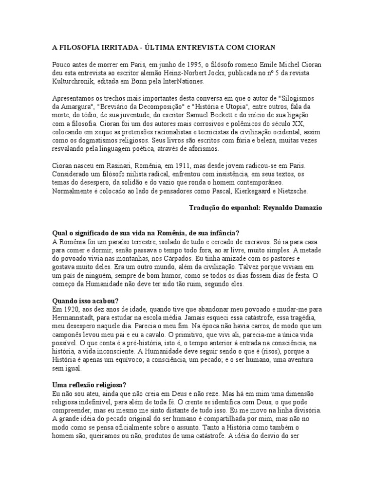 Pouco antes de morrer em Paris, em junho de 1995, o filósofo romeno Emile Michel Cioran deu esta entrevista ao escritor alemão Heinz-Norbert Jocks, publicada no nº 5 da revista Kulturchronik, editada em Bonn pela InterNationes.