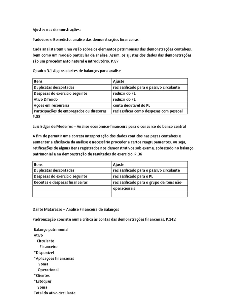 os elementos patrimoniais das demonstraes contbeis, bem como um modelo particular de anlise. Assim, os ajustes dos dados das demonstraes so um procedimento natural e introdutrio. P.87 Quadro 3.1 Alguns ajustes de balanos para anlise Itens Duplicatas descontadas Despesas do exerccio seguinte Ativo Diferido Aoes em resouraria Participaes de empregados ou diretores P.88 Ajuste reclassificado para o passivo circulante reduzir do PL reduzir do PL conta dedutvel do PL reclassificar como despesas com pessoal