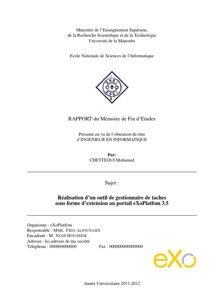 Organisme : eXoPlatfom Responsable : M ME . F IDA ALJOUNAIDI Encadrant : M. N JAH H OUSSEM Adresse : Ici adresse de ma socit Tlphone : 000000000000 Fax : 000000000000000