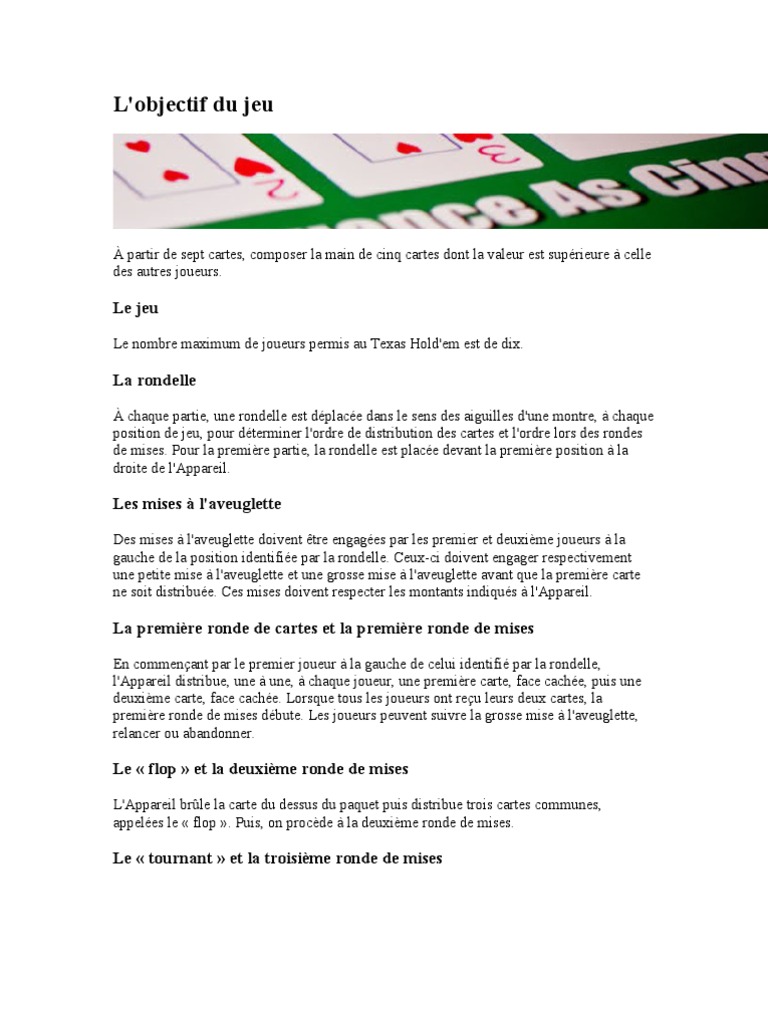 Le Texas Hold'em se joue avec un paquet de 52 cartes. La valeur des cartes dans l'ordre dcroissant est l'as, le roi, la dame, le valet, le 10, le 9, le 8, le 7, le 6, le 5, le 4, le 3 et le 2. L'as peut cependant tre utilis pour former une quinte ou une squence as-2-3-4-5.