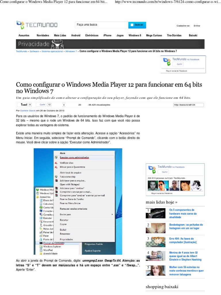 TecMundo » Software » Sistema operacional » Windows 7 » Como configurar o Windows Media Player 12 para funcionar em 64 bits no Windows 7