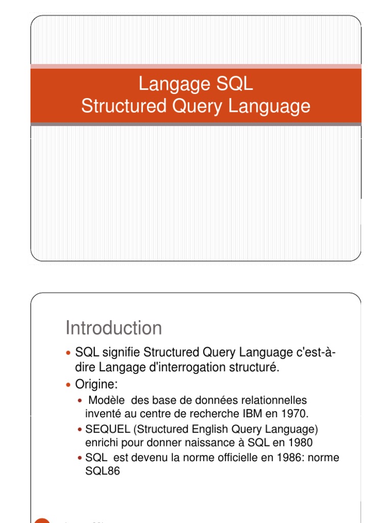 invent au centre de recherche IBM en 1970. SEQUEL (Structured English Query Language) enrichi pour donner naissance SQL en 1980 SQL est devenu la norme officielle en 1986: norme SQL86