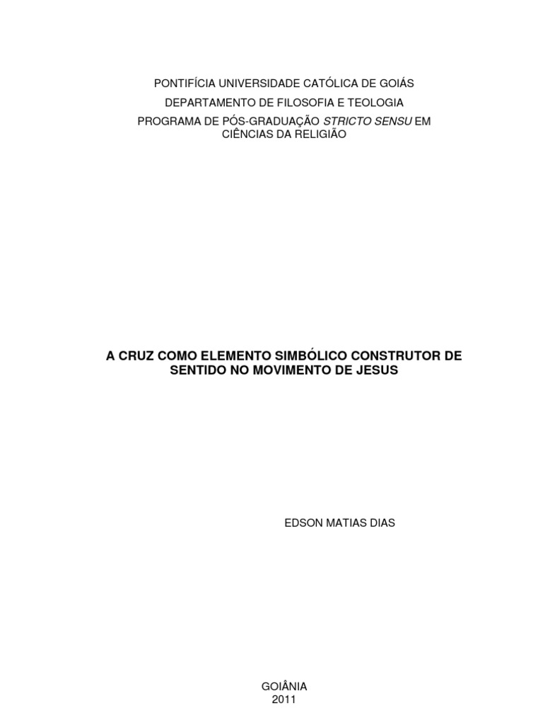 DIAS, Edson Matias. A Cruz como elemento simblico construtor de sentido no Movimento de Jesus. Goinia: PUC Gois, 2011. Esta dissertao trata sobre o simbolismo no Movimento de Jesus, envolvendo o sistema simblico desse grupo, mais especificamente a Cruz como elemento cultural agregador de sentido. A metodologia adotada a bibliogrfica. No primeiro captulo retomamos a discusso sobre o sagrado e os smbolos, passando por diversos autores at chegar a uma discusso mais filosfica dos conceitos. Ao avaliar os diversos conceitos estabelecidos dentro das Cincias da Religio sobre o sagrado confeccionamos, com o auxilio de diversos autores, a noo de smbolos e sagrado para a presente pesquisa. No segundo captulo apresentamos o Movimento de Jesus e sua realidade histrica, destacando o valor do carismtico e da necessidade social do grupo que o segue e o reconhecimento do mesmo. Vemos a realidade de dominao a Palestina e as buscas de sadas da opresso dos Imprios, principalmente o Romano, emergindo resistncias e revoltas. Nesse captulo tambm avaliamos a presena cultural de trs elementos: o messianismo, o po e a cruz, trazendo um apanhado histrico-social da constituio dos mesmos. No ltimo captulo relacionamos a emerso sagrada e os sistemas simblicos no Movimento de Jesus na tentativa de construir um Mundo plausvel no sofrimento. Neste captulo desatacamos a anlise dos elementos culturais significativos daquele grupo messianismo, po e cruz -, enfocando de maneira especial a Cruz como elemento simblico construtor de sentido.