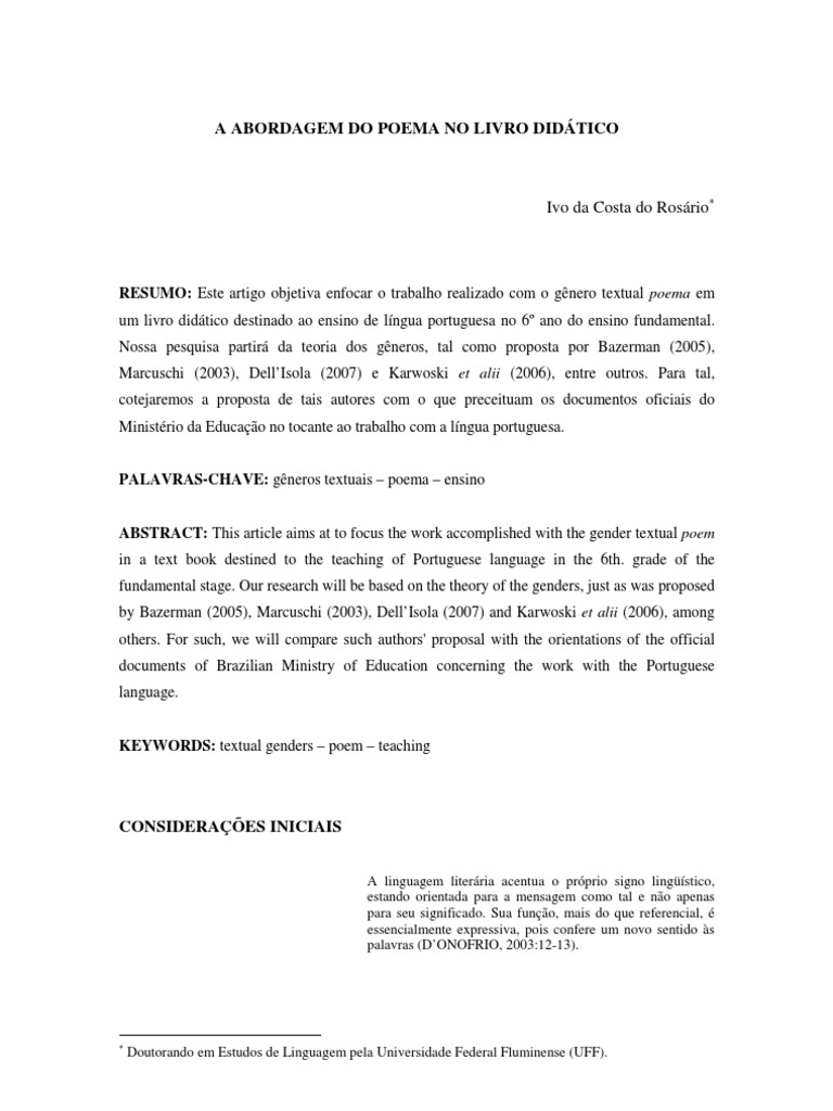 RESUMO: Este artigo objetiva enfocar o trabalho realizado com o gnero textual poema em um livro didtico destinado ao ensino de lngua portuguesa no 6 ano do ensino fundamental. Nossa pesquisa partir da teoria dos gneros, tal como proposta por Bazerman (2005), Marcuschi (2003), DellIsola (2007) e Karwoski et alii (2006), entre outros. Para tal, cotejaremos a proposta de tais autores com o que preceituam os documentos oficiais do Ministrio da Educao no tocante ao trabalho com a lngua portuguesa.