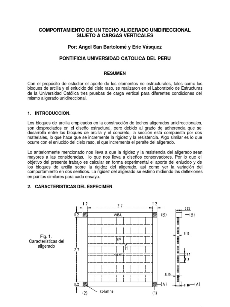 Los bloques de arcilla empleados en la construccin de techos aligerados unidireccionales, son despreciados en el diseo estructural, pero debido al grado de adherencia que se desarrolla entre los bloques de arcilla y el concreto, la seccin est compuesta por dos materiales, lo que hace que se incremente la rigidez y la resistencia. Algo similar es lo que ocurre con el enlucido del cielo raso, el que incrementa el peralte del aligerado. Lo anteriormente mencionado nos lleva a que la rigidez y la resistencia del aligerado sean mayores a las consideradas, lo que nos lleva a diseos conservadores. Por lo que el objetivo del presente trabajo es calcular en forma experimental el aporte del enlucido y de los bloques de arcilla sobre la rigidez del aligerado, as como ver la variacin del comportamiento en dos sentidos. La rigidez del aligerado se estim midiendo las deflexiones en puntos similares para cada ensayo.