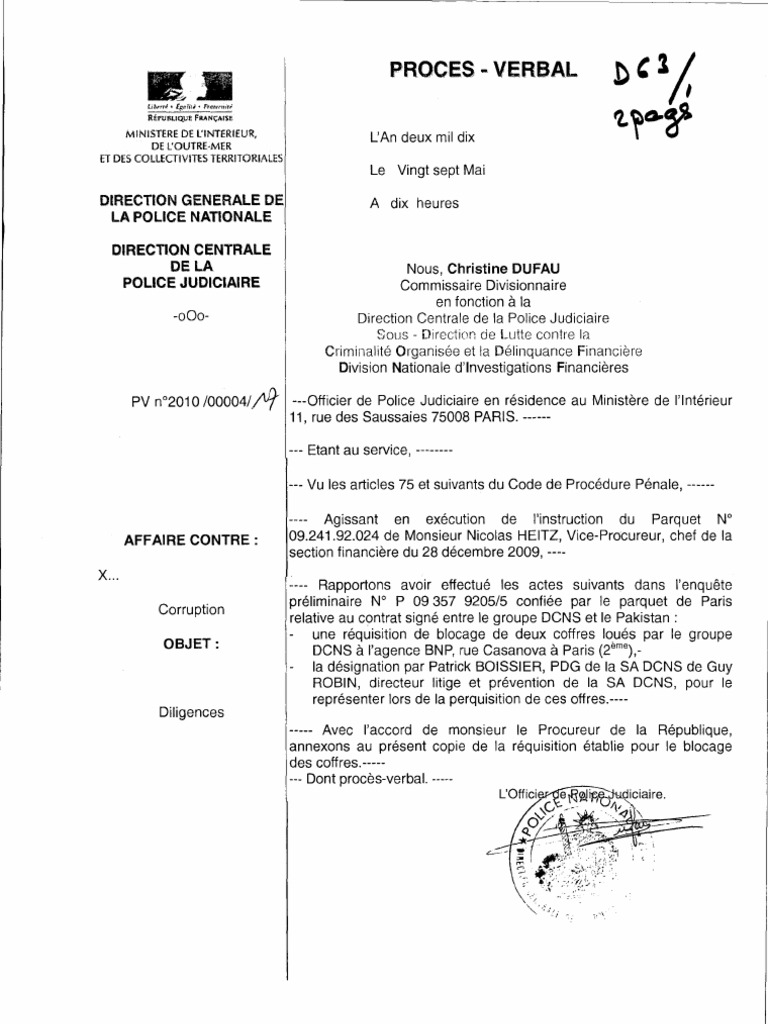 PV n2010 /00004// ---Officier de Police Judiciaire en rsidence au Ministre de l'Intrieur 11, rue des Saussaies 75008 PARIS. -------- Etant au service, ---- Vu les articles 75 et suivants du Code de Procdure Pnale, --------- Agissant en excution de l'instruction du Parquet N [Link] de Monsieur Nicolas HEITZ, Vice-Procureur, chef de la section financire du 28 dcembre 2009, ------- Rapportons avoir effectu les actes suivants dans l'enqute prliminaire N P 09 357 9205/5 confie par le parquet de Paris relative au contrat sign entre le groupe DCNS et le Pakistan : - une rquisition de blocage de deux coffres lous par le groupe DCNS l'agence BNP, rue Casanova Paris (2 me\ - la dsignation par Patrick BOISSIER, PDG de la SA DCNS de Guy ROBIN, directeur litige et prvention de la SA DCNS, pour le reprsenter lors de la perquisition de ces offres.-------- Avec l'accord de monsieur le Procureur de la Rpublique, annexons au prsent copie de la rquisition tablie pour le blocage des coffres.------- Dont procs-verbal. ----L'Off ici e lJ Tud ici,
