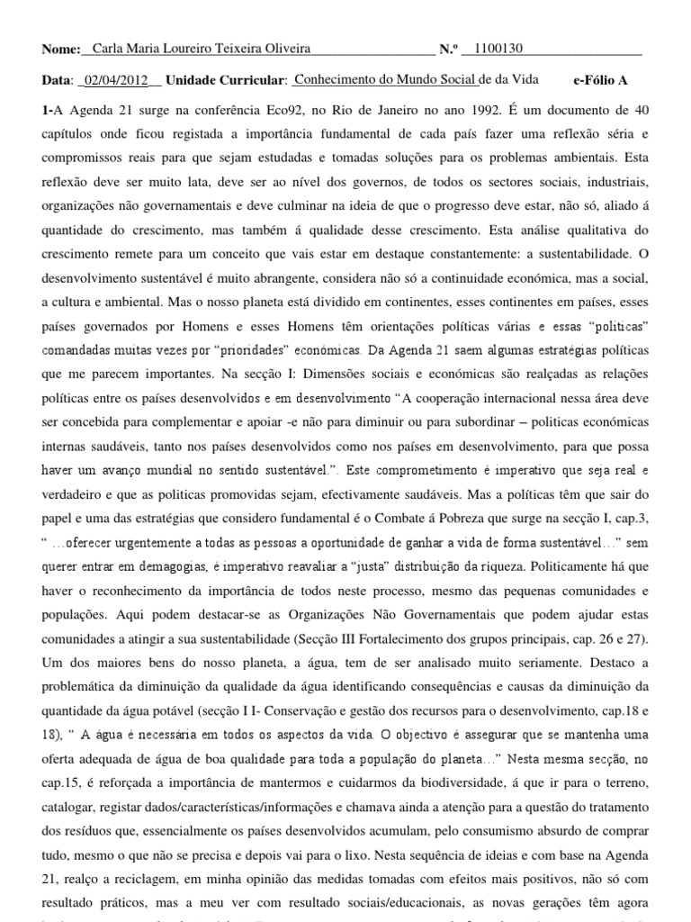 1-A Agenda 21 surge na conferncia Eco92, no Rio de Janeiro no ano 1992. um documento de 40 captulos onde ficou registada a importncia fundamental de cada pas fazer uma reflexo sria e compromissos reais para que sejam estudadas e tomadas solues para os problemas ambientais. Esta reflexo deve ser muito lata, deve ser ao nvel dos governos, de todos os sectores sociais, industriais, organizaes no governamentais e deve culminar na ideia de que o progresso deve estar, no s, aliado quantidade do crescimento, mas tambm qualidade desse crescimento. Esta anlise qualitativa do crescimento remete para um conceito que vais estar em destaque constantemente: a sustentabilidade. O desenvolvimento sustentvel muito abrangente, considera no s a continuidade econmica, mas a social, a cultura e ambiental. Mas o nosso planeta est dividido em continentes, esses continentes em pases, esses pases governados por Homens e esses Homens tm orientaes polticas vrias e essas politicas comandadas muitas vezes por prioridades econmicas. Da Agenda 21 saem algumas estratgias polticas que me parecem importantes. Na seco I: Dimenses sociais e econmicas so realadas as relaes polticas entre os pases desenvolvidos e em desenvolvimento A cooperao internacional nessa rea deve ser concebida para complementar e apoiar -e no para diminuir ou para subordinar politicas econmicas internas saudveis, tanto nos pases desenvolvidos como nos pases em desenvolvimento, para que possa haver um avano mundial no sentido sustentvel.. Este comprometimento imperativo que seja real e verdadeiro e que as politicas promovidas sejam, efectivamente saudveis. Mas a polticas tm que sair do papel e uma das estratgias que considero fundamental o Combate Pobreza que surge na seco I, cap.3, oferecer urgentemente a todas as pessoas a oportunidade de ganhar a vida de forma sustentvel sem querer entrar em demagogias, imperativo reavaliar a justa distribuio da riqueza. Politicamente h que haver o reconhecimento da importncia de todos neste processo, mesmo das pequenas comunidades e populaes. Aqui podem destacar-se as Organizaes No Governamentais que podem ajudar estas comunidades a atingir a sua sustentabilidade (Seco III Fortalecimento dos grupos principais, cap. 26 e 27). Um dos maiores bens do nosso planeta, a gua, tem de ser analisado muito seriamente. Destaco a problemtica da diminuio da qualidade da gua identificando consequncias e causas da diminuio da quantidade da gua potvel (seco I I- Conservao e gesto dos recursos para o desenvolvimento, cap.18 e 18), A gua necessria em todos os aspectos da vida. O objectivo assegurar que se mantenha uma oferta adequada de gua de boa qualidade para toda a populao do planeta Nesta mesma seco, no cap.15, reforada a importncia de mantermos e cuidarmos da biodiversidade, que ir para o terreno, catalogar, registar dados/caractersticas/informaes e chamava ainda a ateno para a questo do tratamento dos resduos que, essencialmente os pases desenvolvidos acumulam, pelo consumismo absurdo de comprar tudo, mesmo o que no se precisa e depois vai para o lixo. Nesta sequncia de ideias e com base na Agenda 21, realo a reciclagem, em minha opinio das medidas tomadas com efeitos mais positivos, no s com resultado prticos, mas a meu ver com resultado sociais/educacionais, as novas geraes tm agora intrinsecamente o valor de reciclar. Este sucesso passou, a meu ver, pelo facto de as ideias terem sado do