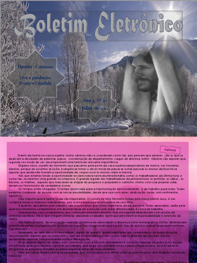 Diante da tarefa na causa esprita muitos obreiros no se consideram como tais, pois pensam que obreiros so os que se dedicam a atividades de palestras, passes, coordenao de departamento, cargos de diretoria, enfim. Obreiros so aqueles que, segundo seu modo de ver, desempenham uma tarefa de relevante importncia. Engano nosso, a partir do momento que passamos pela porta da casa esprita independente do motivo, nos tornamos obreiros, porque ao ouvirmos as lies evanglicas temos o dever moral de passar as outras pessoas os ensinos da Boa Nova aqueles que ainda no tiveram a oportunidade de, sequer ouvir os ensinos sobre a mesma. Ns que estamos tendo a oportunidade esclarecedora nesta doutrina Bendita, somos os trabalhadores da ltima hora, e como tais, recebemos uma grande recompensa. O grande legado dos trabalhadores da primeira hora: os profetas, os sbios , os filsofos, os mrtires, aqueles que marcaram as etapas do progresso e preparam o caminho, muitos com suas prprias vidas, deram seu testemunho de verdadeiros cones. Os tempos esto chegados. O tempo anunciado para a transformao da humanidade, de trabalho para todos. Todos podemos colaborar, de acordo com as nossas possibilidades, desde que seja com amor, dedicao, unio, sem sentimentos egosticos. No importa qual a tarefa, todas so importantes. O convite foi feito h muito tempo pelo nosso Mestre Jesus. A ns compete tomar a charrua e trabalharmos, pois a terra espera pela semeadura de seus filhos. E quando, decidirmos pelo trabalho no esqueamos que somos imperfeitos ainda, portanto, todos aprendizes, razo pela qual encontraremos companheiros em diversas faixas de evoluo com vises diferenciadas cerca do trabalho. Depararemos com companheiros que comeam entusiasticamente, mas em seguida abandonam com receios de enfrentar sacrifcios. H os que chegam otimistas deixando o trabalho assim que percebem a responsabilidade e extenso da tarefa. Uns fazem projetos de renovao, contudo retiram-se ao observarem a diferena entre teoria/prtica. Outros, abandonam a tarefa alegando incompreenso, por no ser o que eles imaginavam que fossem. Mas,de quem a obra? para quem estamos trabalhando? Entretanto, ao lado desses cooperadores, dignos de respeito, ainda inabilitados aos compromissos de longa durao, encontraremos aqueles que reconhecem o valor da empreitada que lhes coube, no se afastam dos deveres, mesmo derramando lgrimas, testemunhando sua f e abnegao. Eis os obreiros dignos ao salrio, pois, caminham com a obra no pensamento e corao, fazendo da prtica seu legado, enfrentando quaisquer desafios inerentes ao trabalho, que exige um constante esforo para chegar a meta, atravs da qual atingiremos os propsitos firmados no plano espiritual, antes de reencarnarmos. No percamos tempo nem a oportunidade, pois esta poder ser a ltima vinda ao planeta antes dele finalizar sua fase de transio! Enviada por Marisa dos Santos_S.E. Irm Rolica