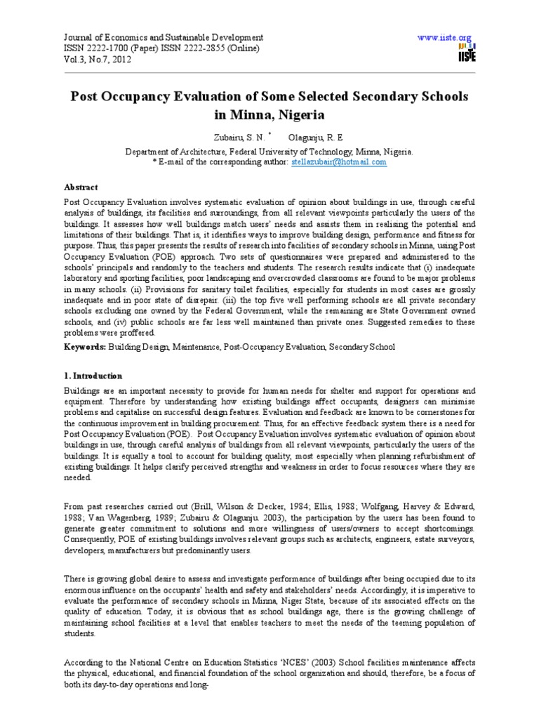 range management priorities. In view of this fact, the research focused on the evaluation of the performance of some selected fourteen secondary schools facilities in Minna. These schools include, (i) Niger Baptist Secondary School (NBSS), (ii) Government Day Secondary School (GDSS), (iii) Government Secondary School (GSS), (iv) Girls Day Junior Secondary School (GDJSS), (v) Maryam Babangida Girls Science Secondary School, (vi) Ahmadu Bahago Boys Secondary School, (vii) Bosso Secondary School, (viii) Hilltop Model School, (ix) El-Amin International Secondary school, (x) Decs New College and Day Secondary school, Tudun Wada, (xi) Tunga Day Secondary School, (xii) Army Day Secondary School, Tunga, (xiii) Federal Government College and (xiv) Government Technical College Tunga, Minna. 2. Literature Review Post-occupancy Evaluation is a method of measuring the performance of a building in use, with respect to the brief, the goals of the design team, and the activities and feelings of the users (Van Wagenberg, 1989; Zubairu, 2006). The buildings occupants evaluate the suitability of the building to meet their particular needs (Barrett,1995). The term Post Occupancy Evaluation (POE) was coined over 25 years ago and comprises all activities that originate out of an interest in learning how a building performs once it is built and occupied, including if and how well it has met expectations and how satisfied building users are with the environment that has been created. Precisely, Post Occupancy Evaluation involves systematic evaluation of opinions about buildings in use, from the perspective of the people who use them. Preiser, Rabinowitz & White (1988) further defined POE as a process of evaluating buildings in a systematic and rigorous manner after they have been built and occupied for some time. Many actors participate in the use of buildings, they include investors, owners, operators, maintenance staff, and perhaps most important of all, the end users. Post Occupancy Evaluation (POE) differs significantly from conventional surveys and market research. It uses the direct, unmediated experiences of building users as the basis for evaluating how a building works for its intended purpose. There are three levels of POE: Indicative, investigative and diagnostic. The indicative POE is the first level carried out in a short period of time to determine whether there are serious problems in the building. The next level is the investigative POE which is carried out after an indicative POE has identified issues that need further investigation. The third level is the diagnostic POE which may take from several months to a year and the results are long-term oriented to improve not only a particular facility but also the state of the art in a given building type. Facilities issues arise at all educational levels, from pre-kindergarten through postsecondary, and at all sites, from classrooms to administrative offices. Challenges arise in new and old facilities alike, although the types of concerns may differ (National Centre on Education Statistics, 2003). Facilities provision in schools is concerned with more than construction of building structures. It is also about creating a physical setting that is appropriate and adequate for learning, as well as providing clean and safe environments for children. Post occupancy evaluation involves measuring the suitability and convenience of facilities through the following: