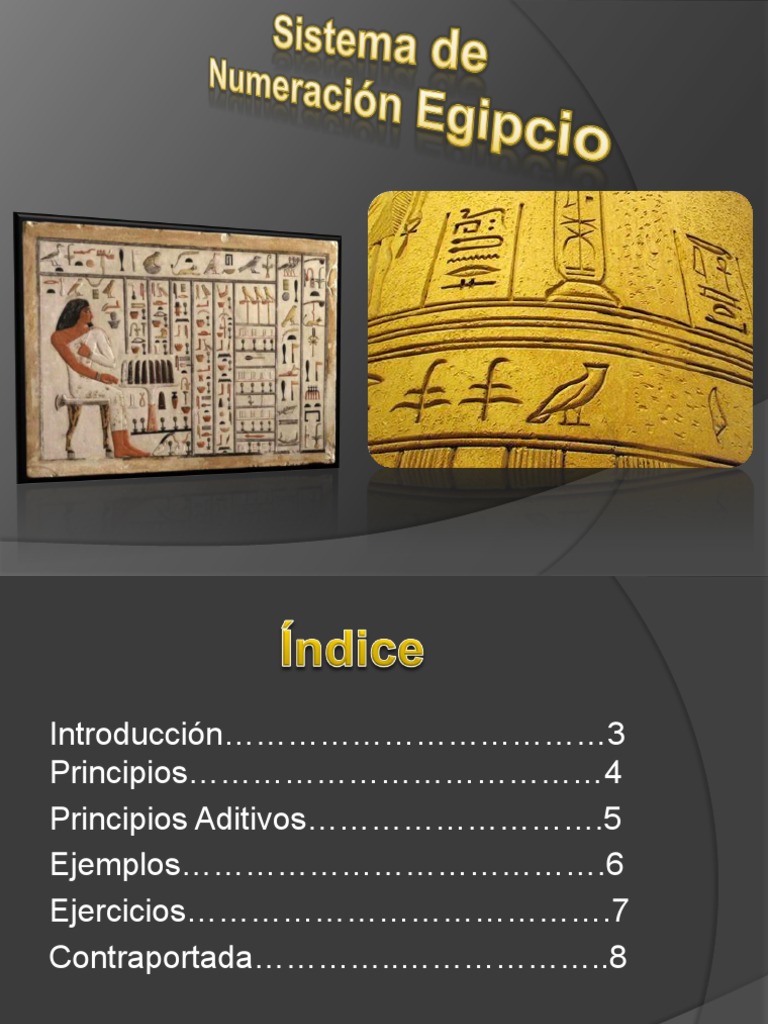Cuando los hombres empezaron a contar usaron los dedos, guijarros, marcas en bastones, nudos en una cuerda y algunas otras formas para ir pasando de un nmero al siguiente. A medida que la cantidad crece se hace necesario un sistema de representacin ms prctico. En diferentes partes del mundo y en distintas pocas se lleg a la misma solucin, cuando se alcanza un determinado nmero se hace una marca distinta que los representa a todos ellos. Este nmero es la base. Se sigue aadiendo unidades hasta que se vuelve a alcanzar por segunda vez el nmero anterior y se aade otra marca de la segunda clase . Cuando se alcanza un nmero determinado (que puede ser diferente del anterior constituyendo la base auxiliar) de estas unidades de segundo orden, las decenas en caso de base 10, se aade una de tercer orden y as sucesivamente. Sin embargo, existen variedades de sistemas de numeracin pero ahora nosotros les hablaremos un poco sobre la numeracin egipcia, ya que es una muy importante e interesante para nosotros.