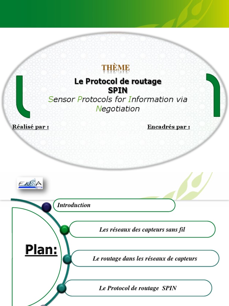 Prsentation du protocole SPIN : SPIN est un protocole centr donnes. Il permet d'conomiser l'nergie. Conu essentiellement pour pallier aux problmes lis lutilisation de la technique dinondation SPIN utilise une structure nomme mta-data qui dcrit les donnes recenses lors de la ngociation de lenvoi des donnes..