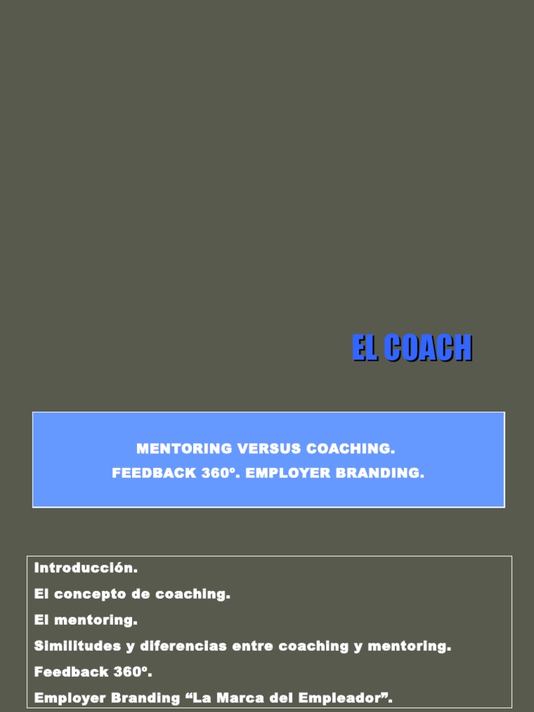 .Directivo coach El coachee es la persona o las personas a las que se les aplica esta práctica.El concepto de coaching.Coach interno. 2. Tipos de coach 1. 3. COACHING: Proceso de acompañamiento individual destinado a impulsar el desarrollo de las capacidades profesionales y personales con el fin de mejorar el rendimiento de una persona o de un grupo.Coach externo o consultor coach. Elementos clave: El coach es aquel que dinamiza y acompaña en la capacidad de aprendizaje y perfeccionamiento a la persona tutelada.