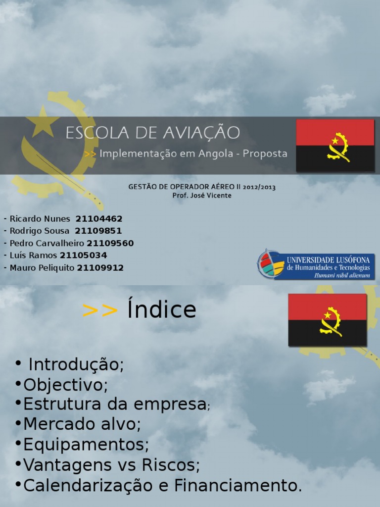 os indivíduos de Países Africanos de Língua Oficial Portuguesa (PALOP). Posto isto.>> Introdução Num mundo cada vez mais globalizado e em que os indivíduos possuem uma capacidade móvel nunca antes vista. de uma Escola de Aviação Civil em Angola destinada a um desses grupos. faz todo o sentido uniformizar e centralizar a formação em uma determinada área a um determinado grupo específico. este facto fomenta o convívio. a troca de experiência e a agilização de procedimentos. hipotética. esta apresentação aborda a criação. Em particular. na aviação. que possuem a língua portuguesa como factor agregador. .